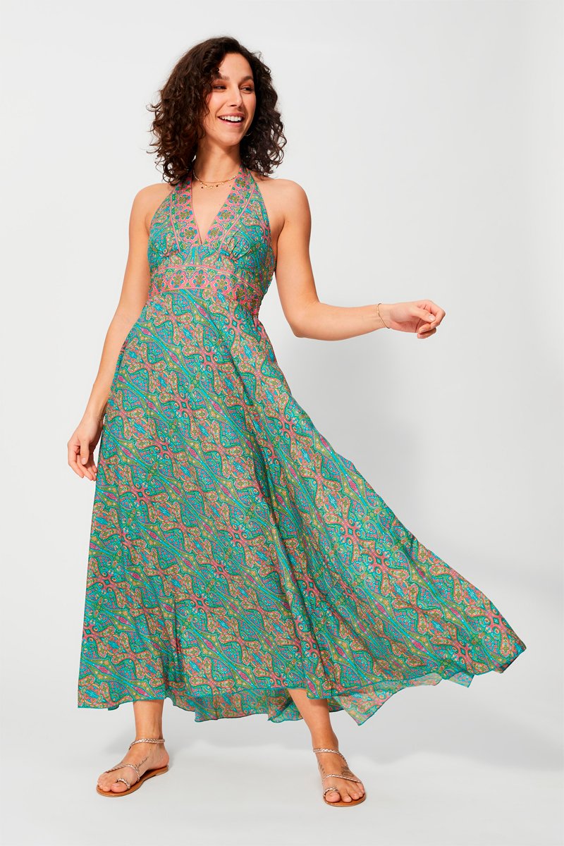 Vestido comprido - Turquesa e rosa - Azul, verde e rosa