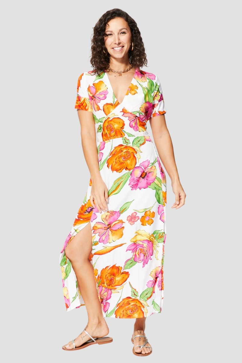 Vestido comprido - Branco e rosa - Azul, verde e rosa