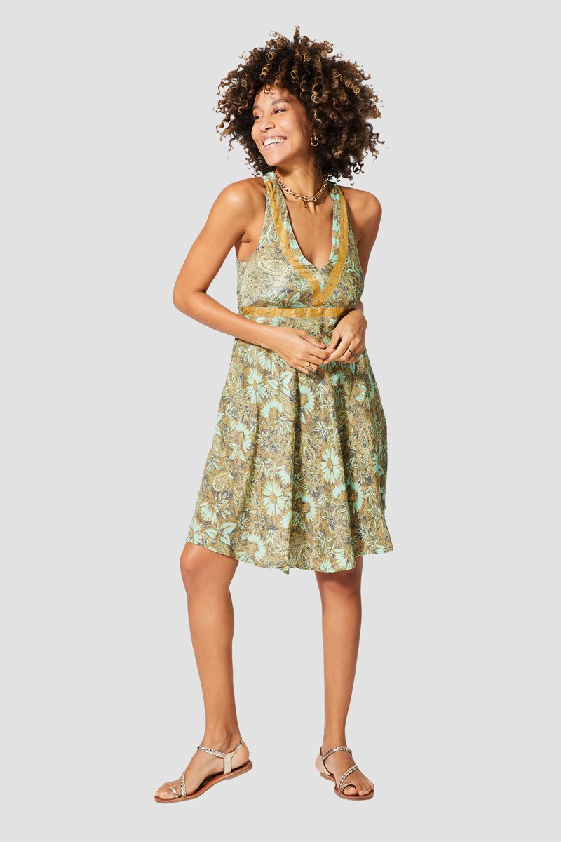 Vestido com folhos - Dourado e bege - Bege e castanho