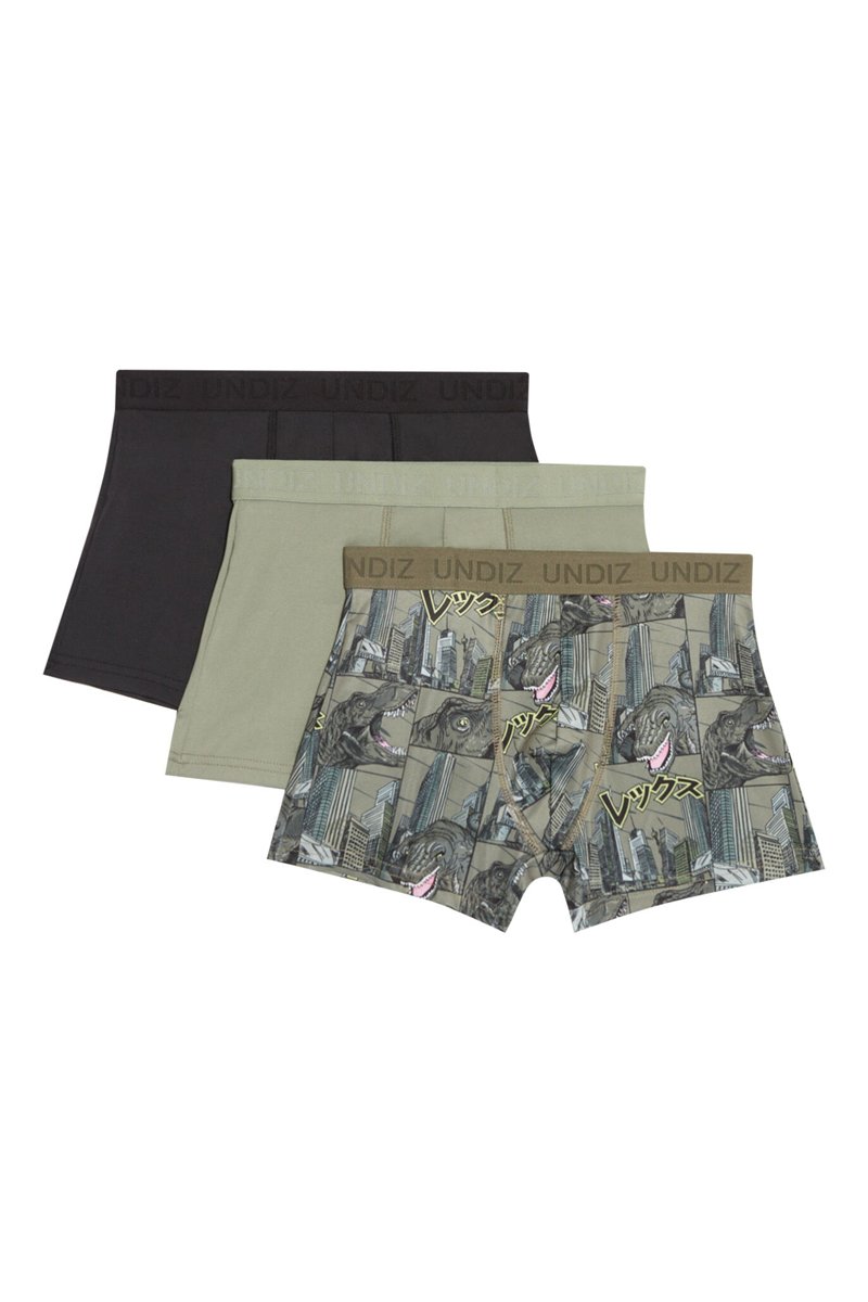 3 boxers, 1 dos quais com inscrição e estampado decorativo.