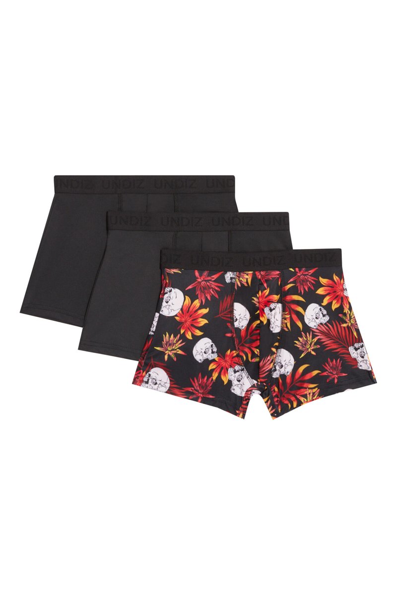 3 boxers, 1 dos quais com estampado decorativo.