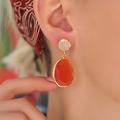 Brincos - Latão banhado a ouro, olho de gato e pedra da lua