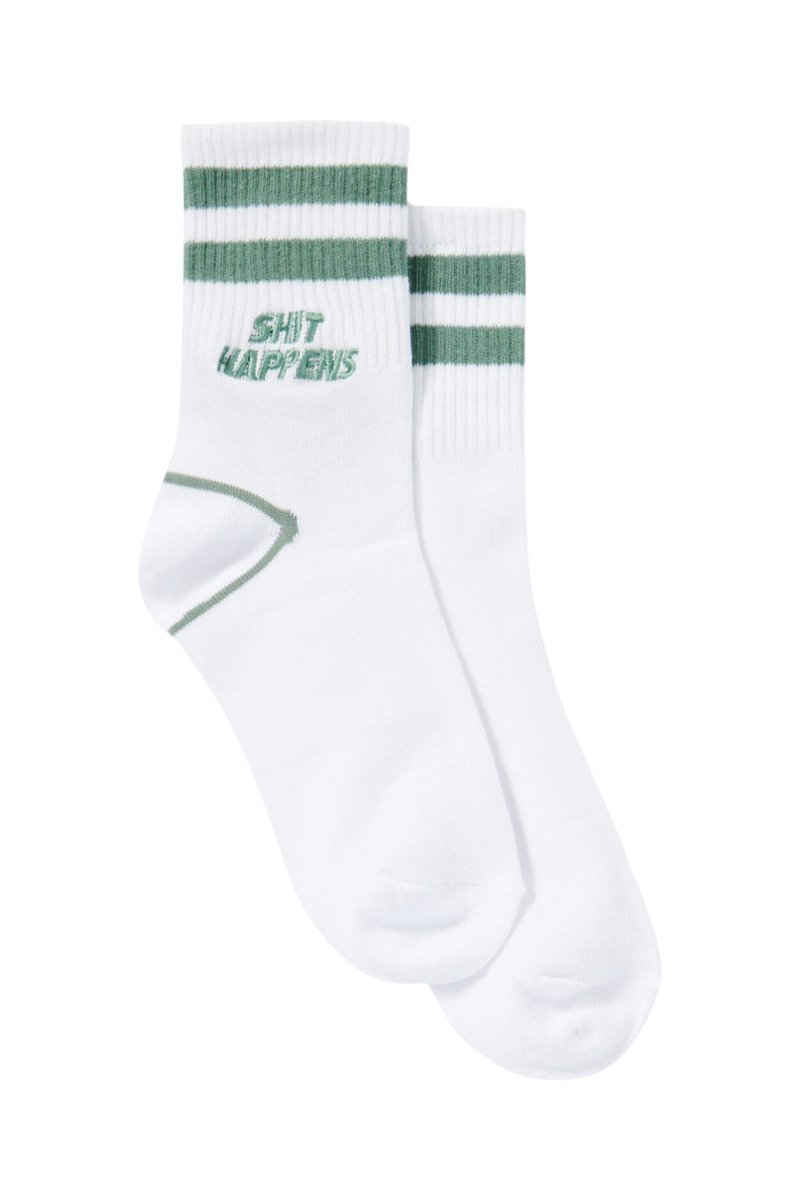 Inscrição bordada, estampado às riscas e malha canelada no cano.