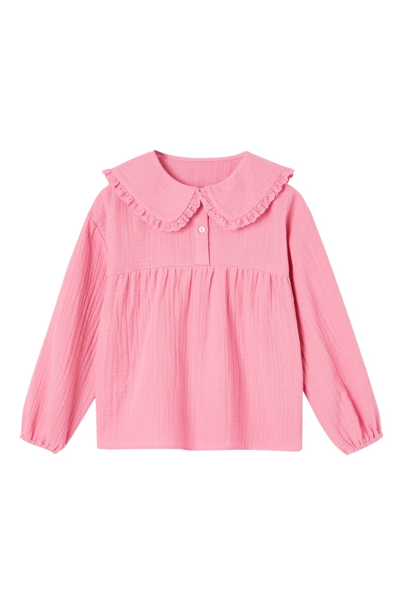 Gola Peter Pan abotoável com folhos em bordado inglês.