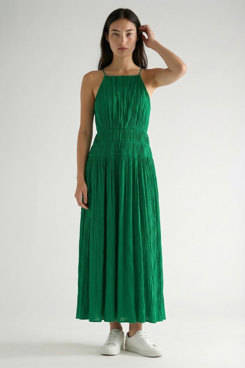 Vestido comprido plissado.