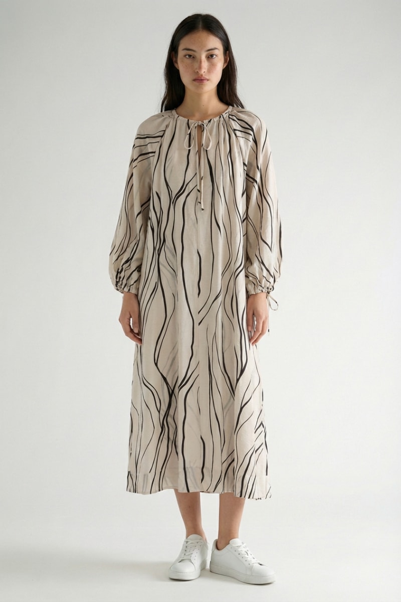 Vestido midi de mangas compridas raglã com atilhos de ajuste.