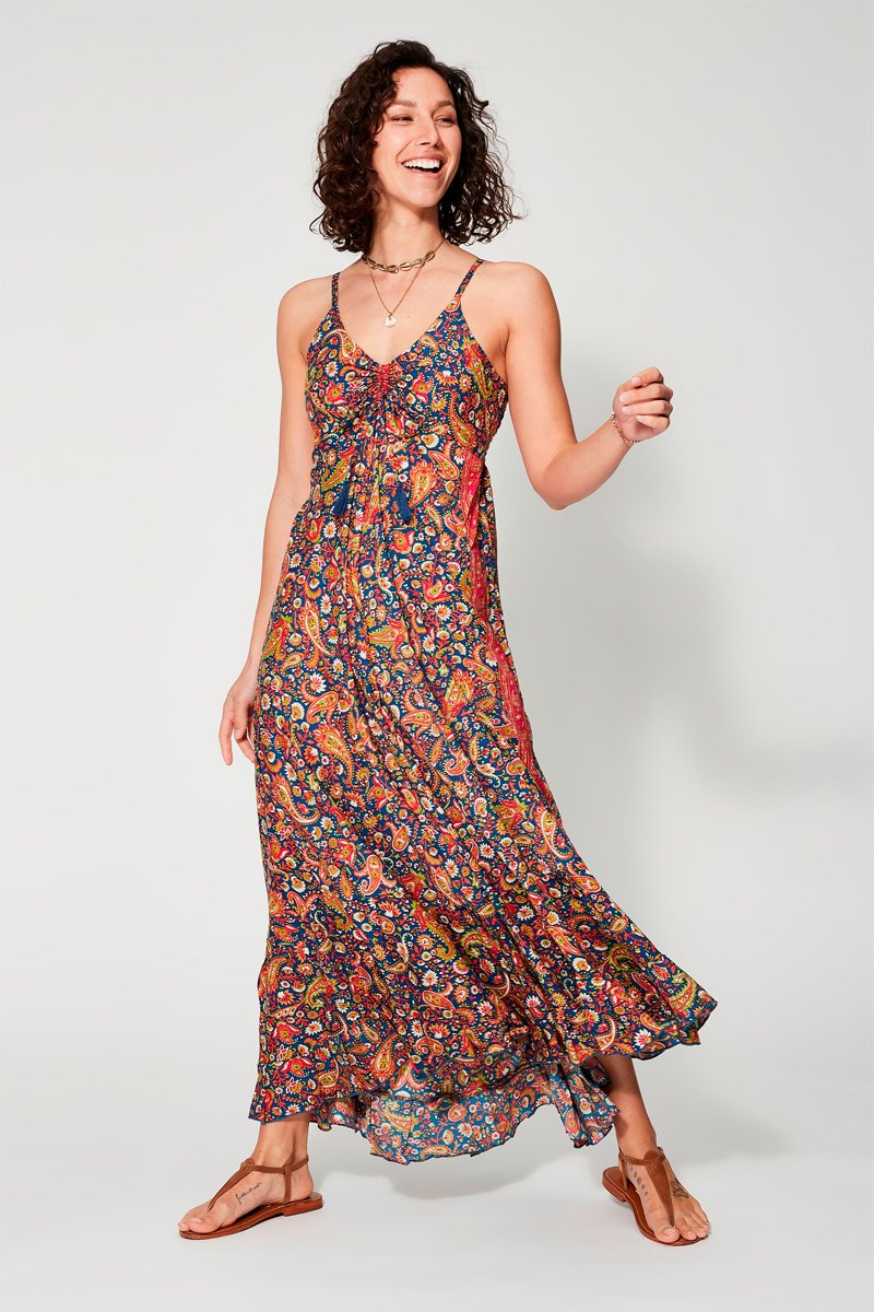 Vestido comprido - Azul-marinho - Vermelho, azul e verde