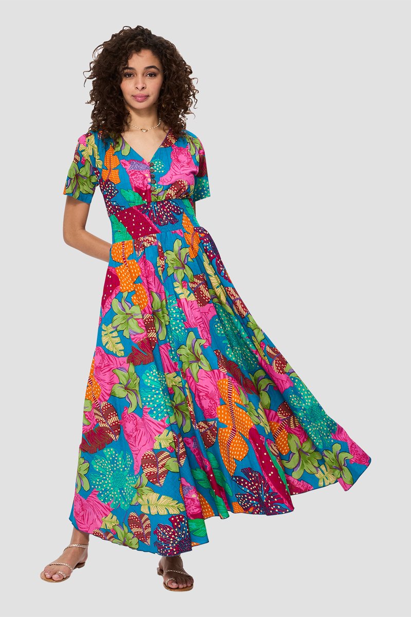 Vestido comprido - Azul-petróleo - Azul, verde e laranja