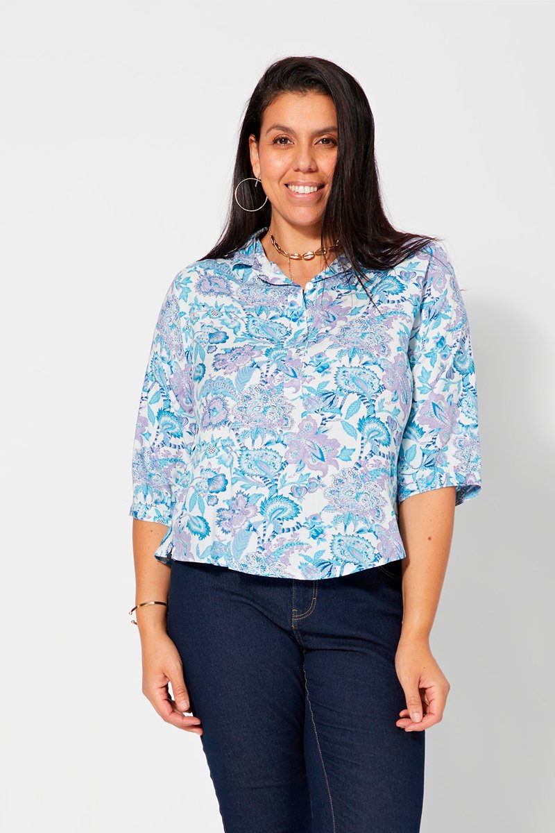 Blusa florida - Branco e azul-claro - Branco, azul e violeta