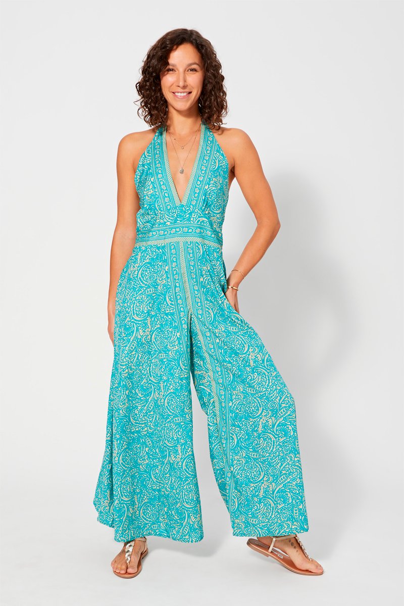 Macacão florido - Turquesa - Bege e azul