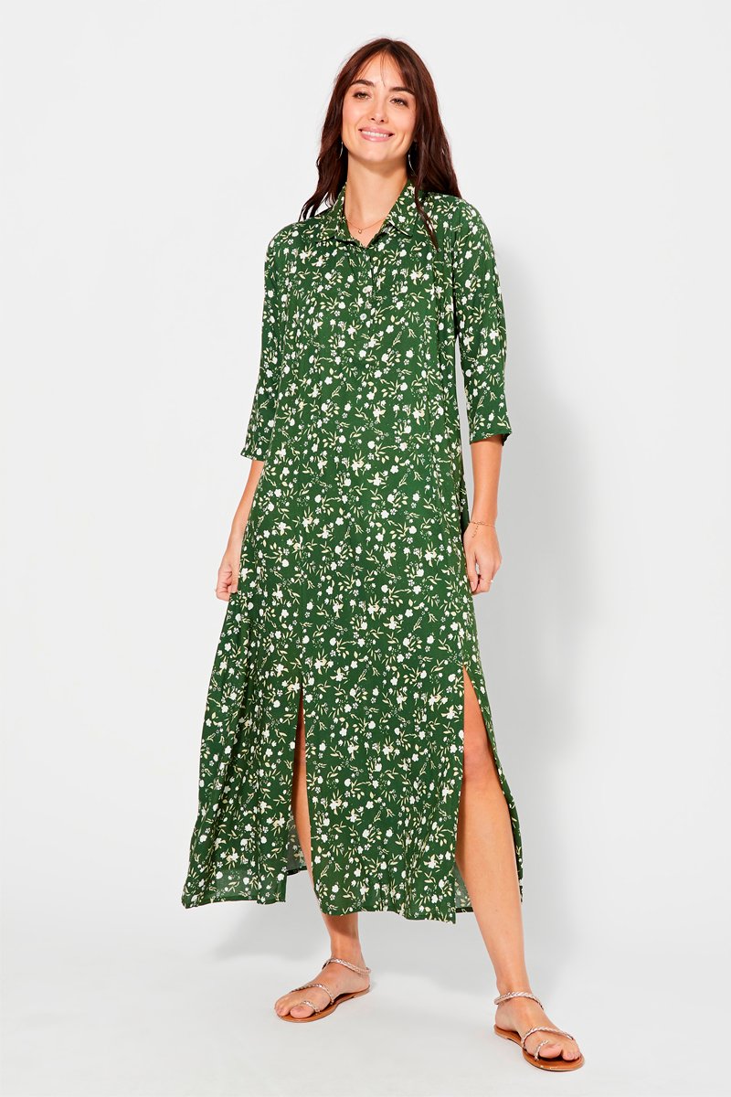 Vestido comprido - Verde-escuro - Branco, bege e verde