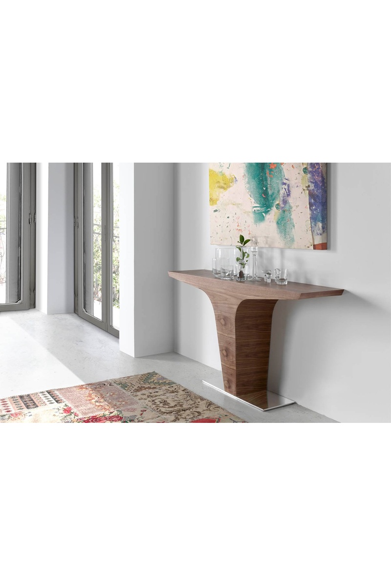 Estrutura em madeira aglomerada com folha de nogueira e aço cromado.