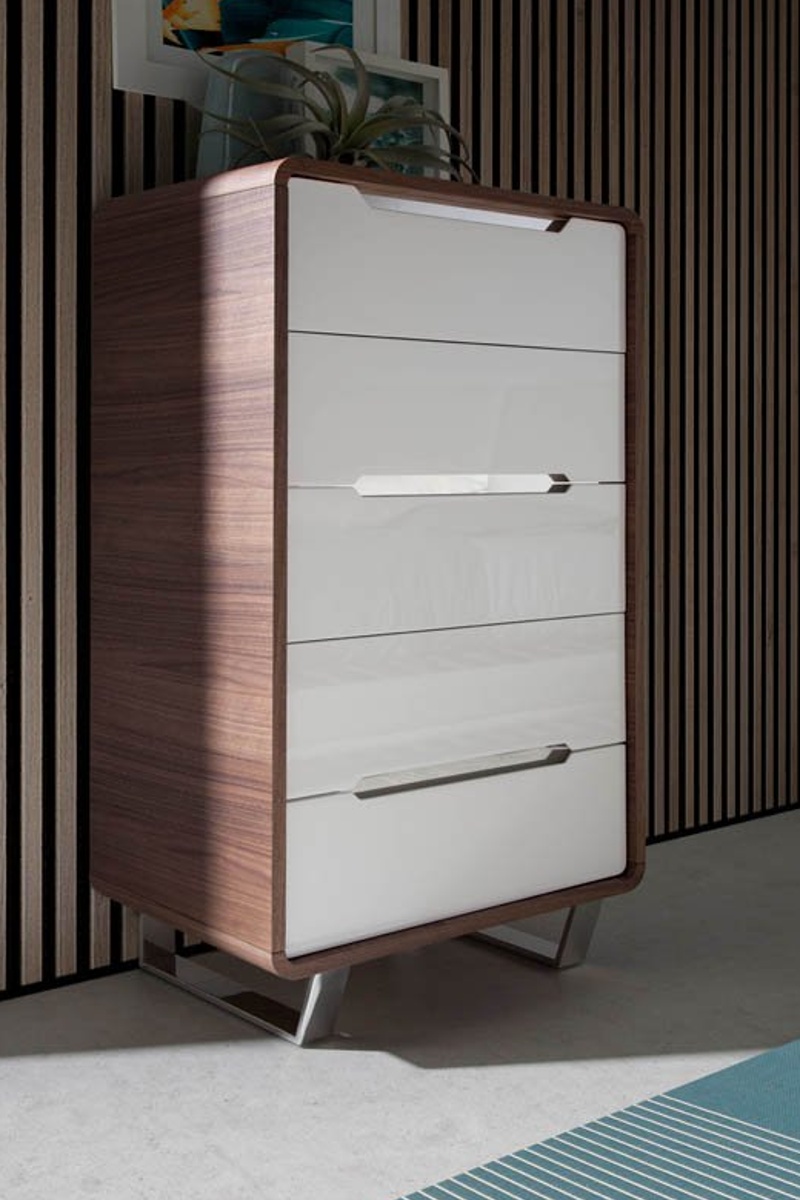 Composição: madeira placada nogueira, MDF lacado brilhante e aço inoxidável