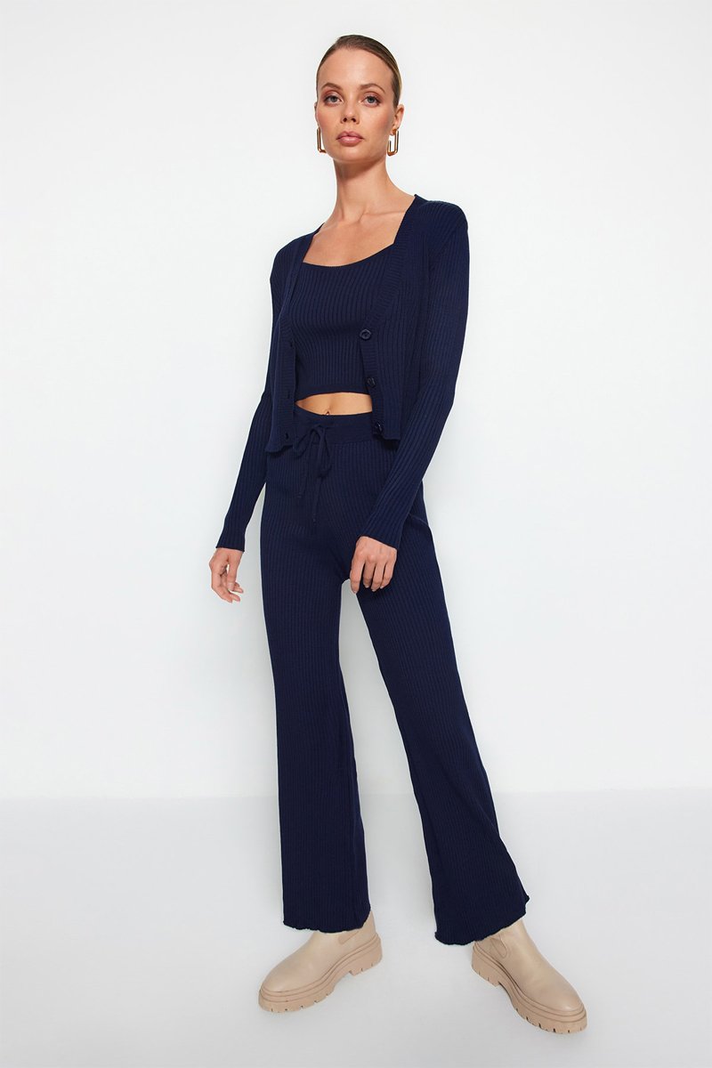 Casaco de malha, Crop top e calças bootcut - Azul-marinho