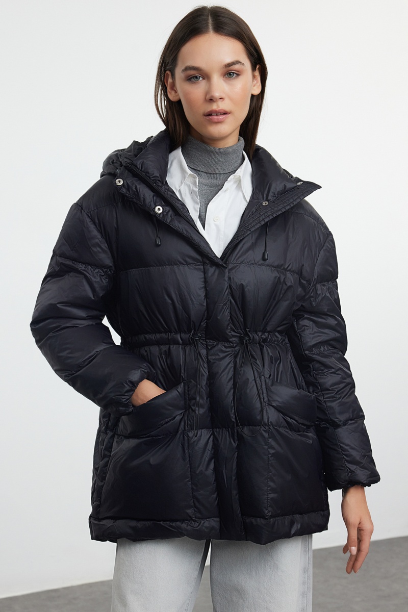 Atilhos de ajuste no capuz e na cintura.