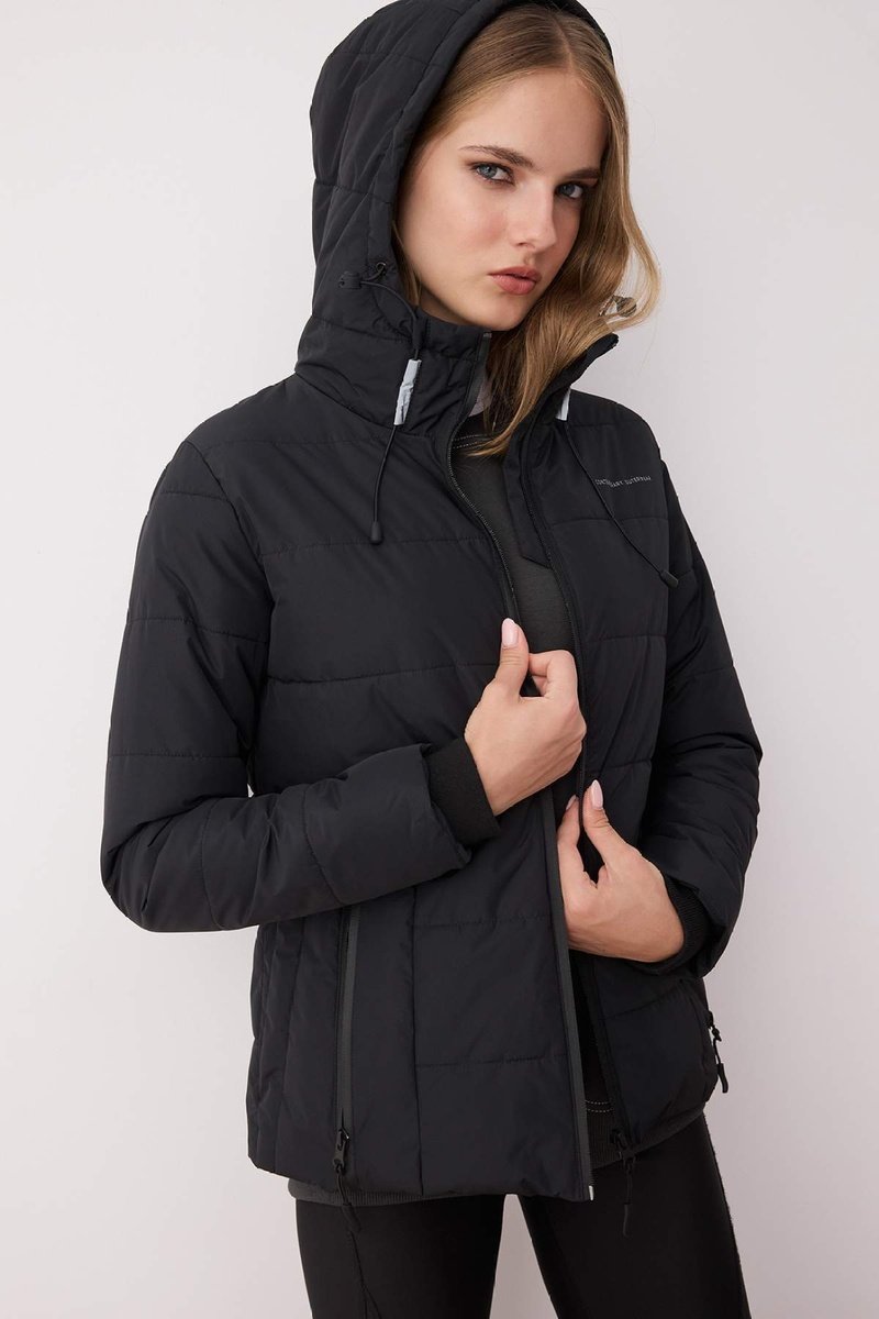Blusão com capuz, atilhos de ajuste e travões de cordão.