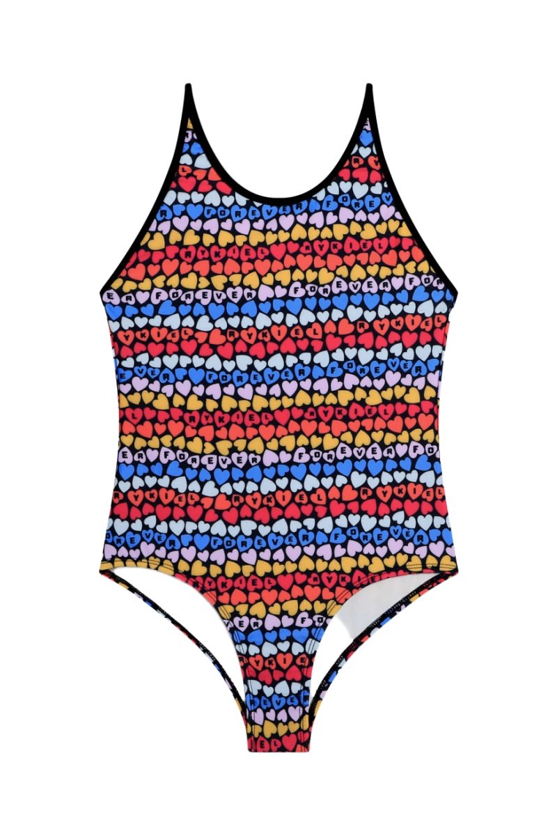 Inscrição, estampado corações e logótipo.