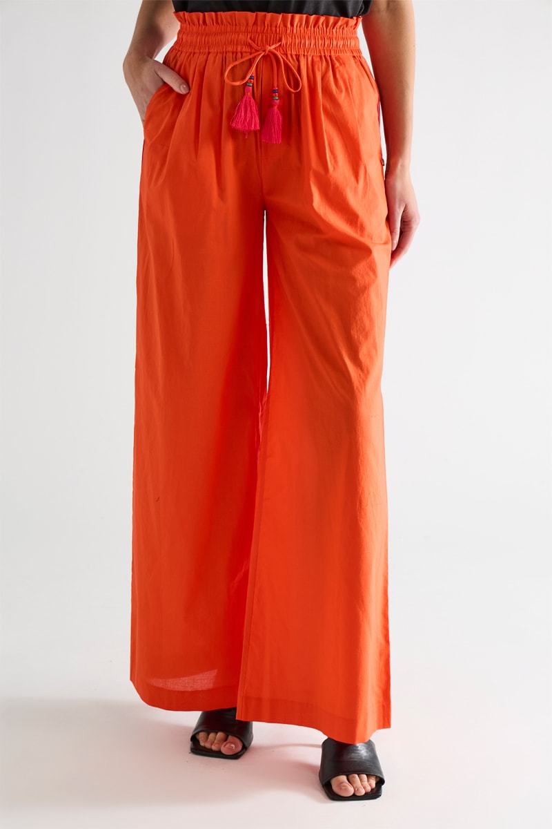 Cintura subida elástica com atilhos de ajuste e pompons.