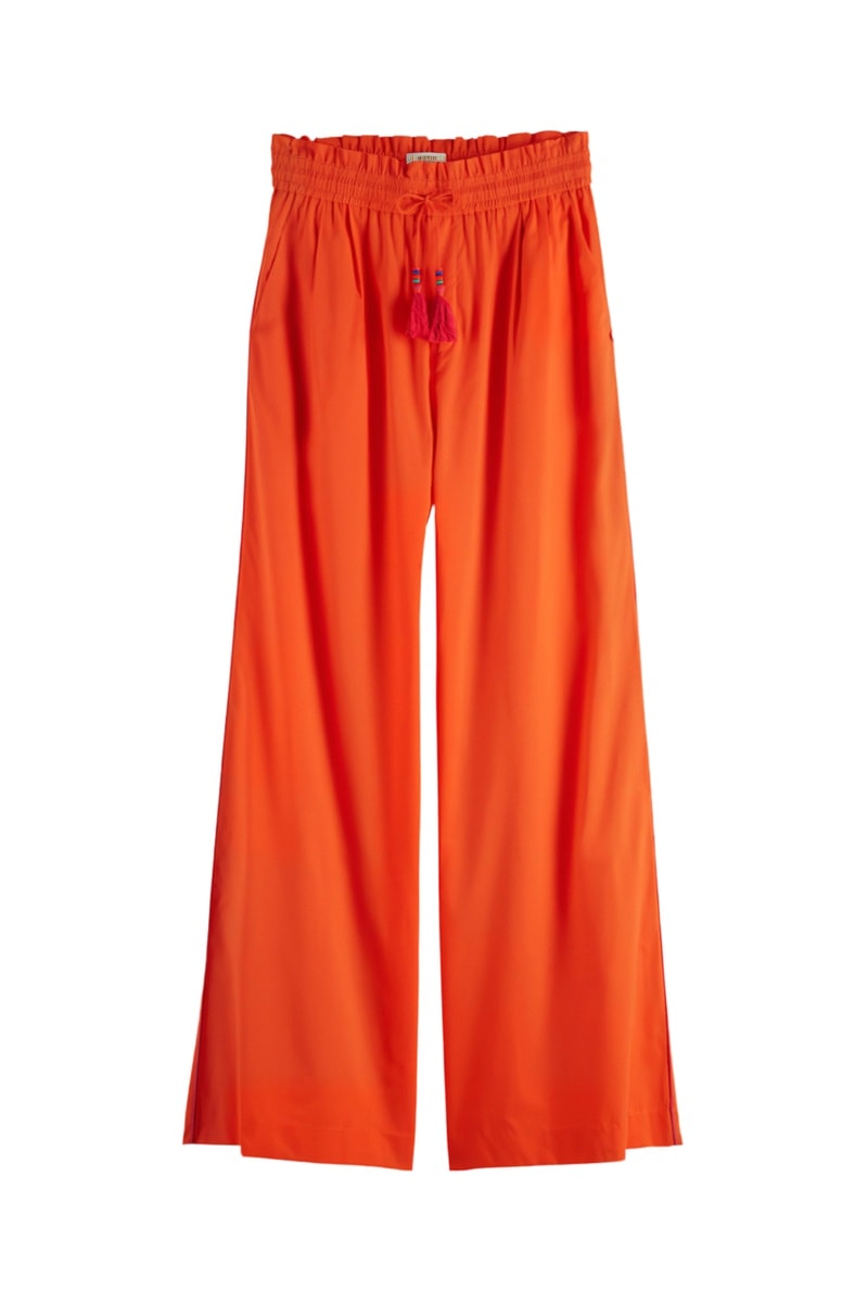 Cintura subida elástica com atilhos de ajuste e pompons.