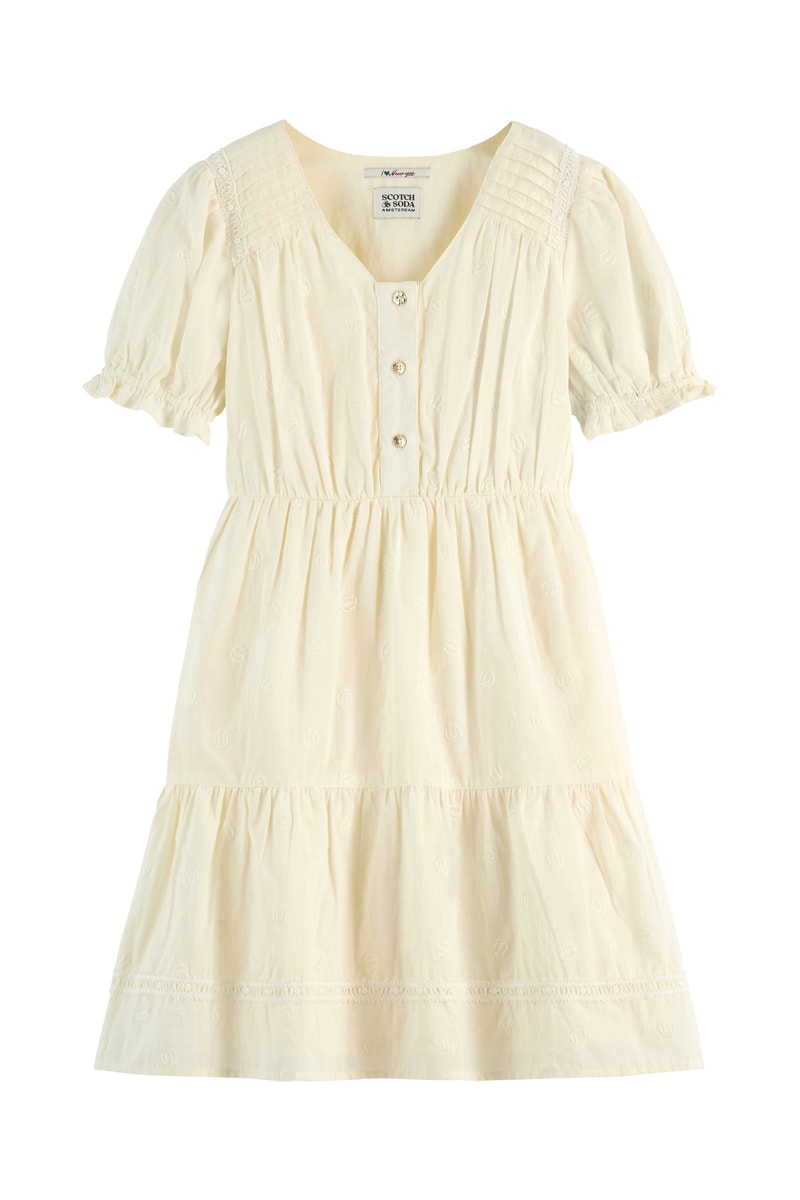 Vestido de mangas curtas volumosas elásticas.