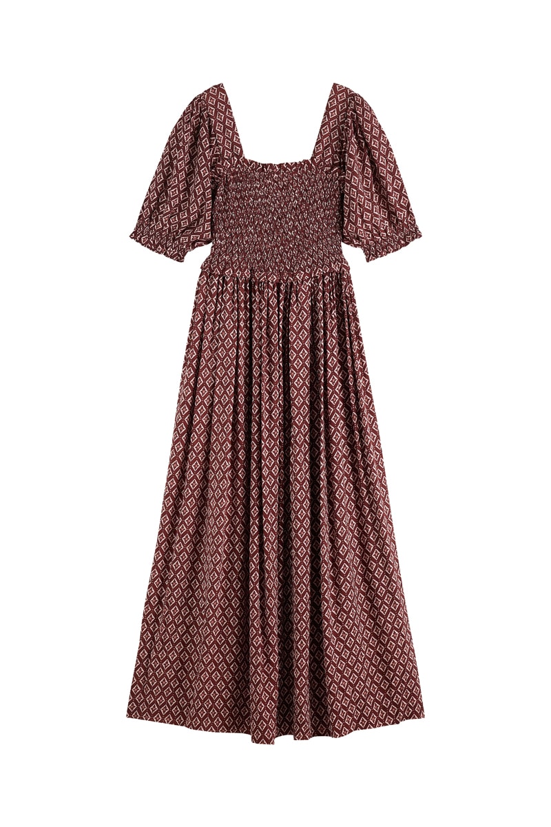 Vestido comprido de mangas curtas volumosas.