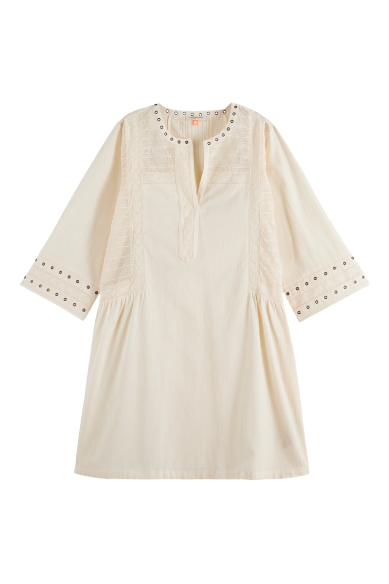 Aplicações com ilhós no decote e nas mangas.