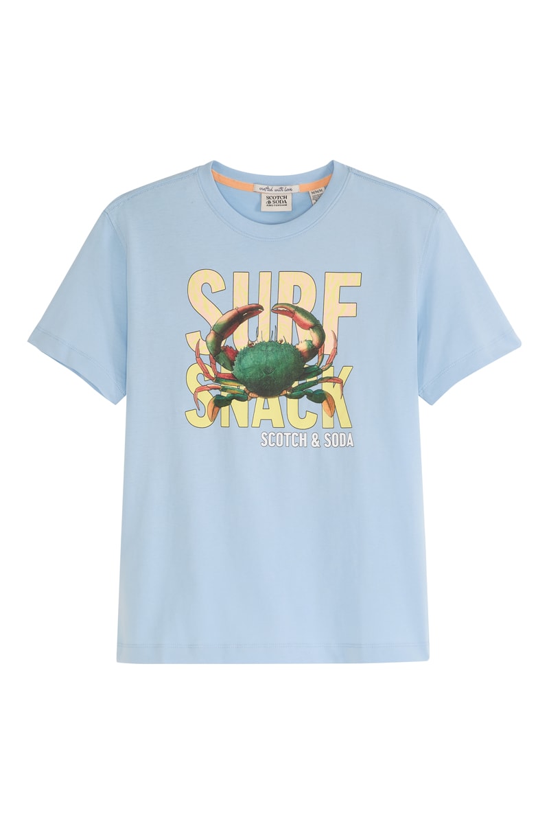 Inscrição, padrão de caranguejo e logótipo à frente.