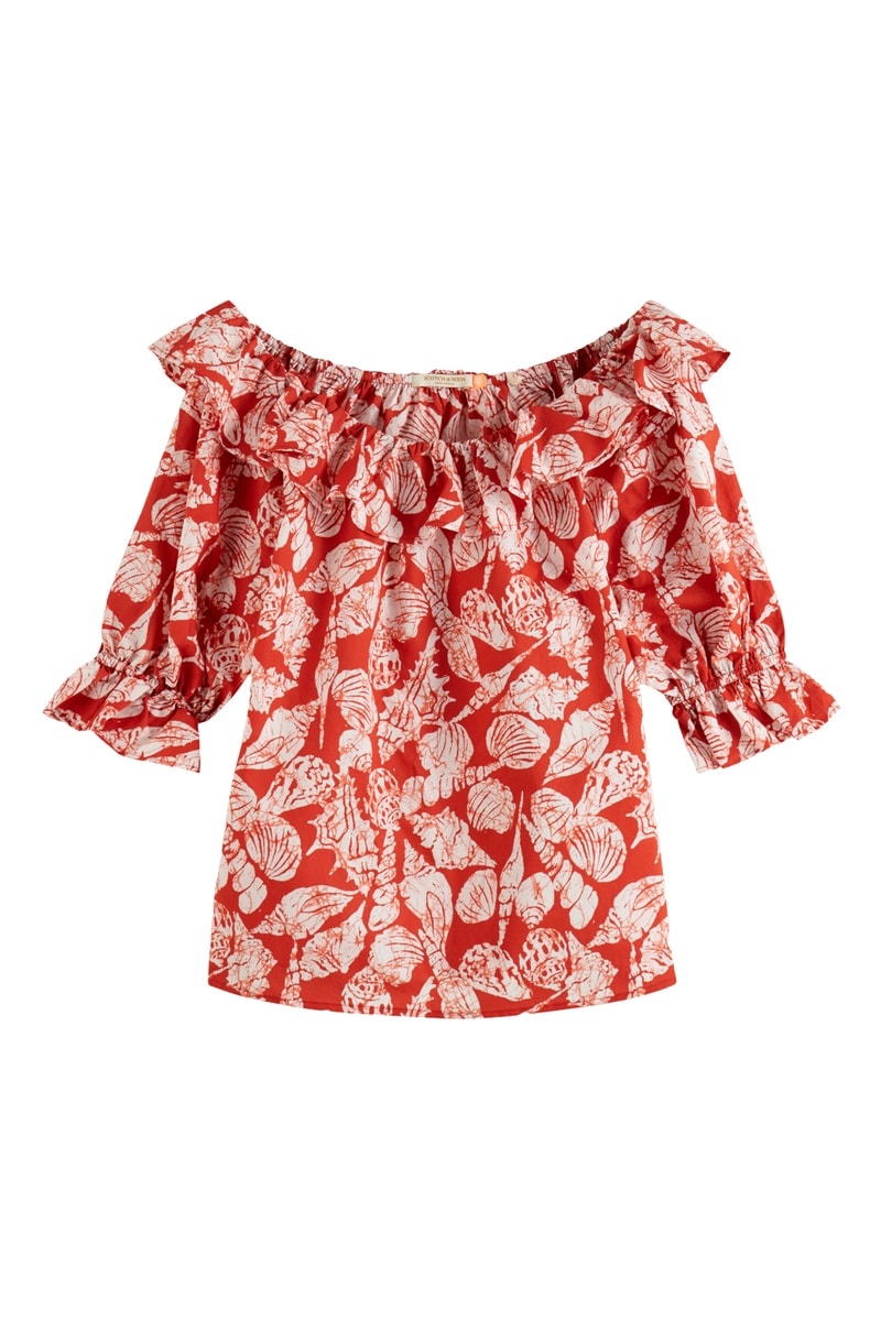 Folhos no decote e nas mangas.