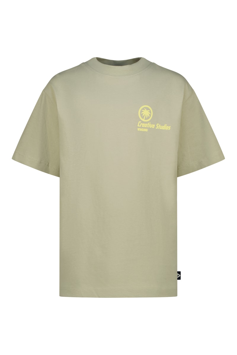 Inscrição, estampado palmeiras e logótipo à frente e atrás.