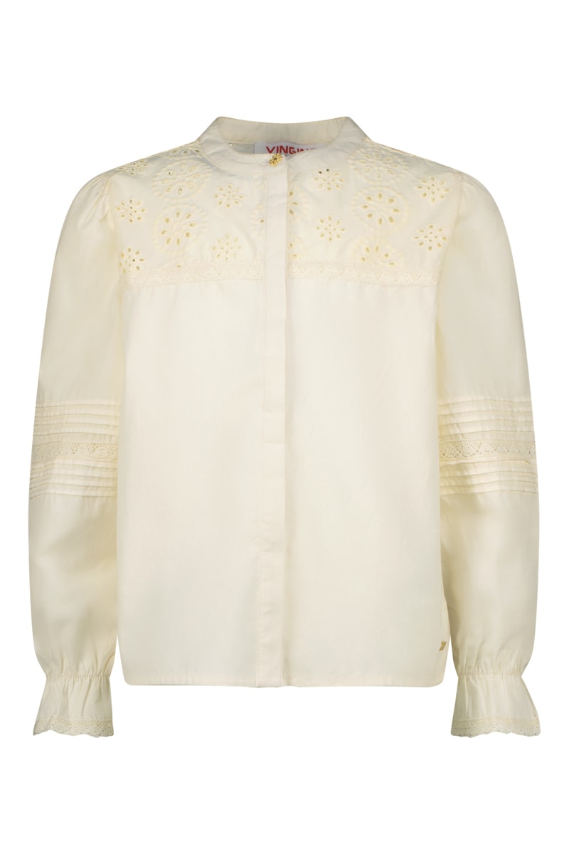 Aplicações em bordado inglês nas mangas, à frente e atrás.