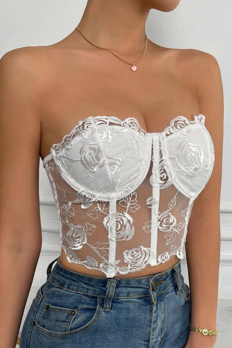 Corpete em tule e tule bordado com aros.