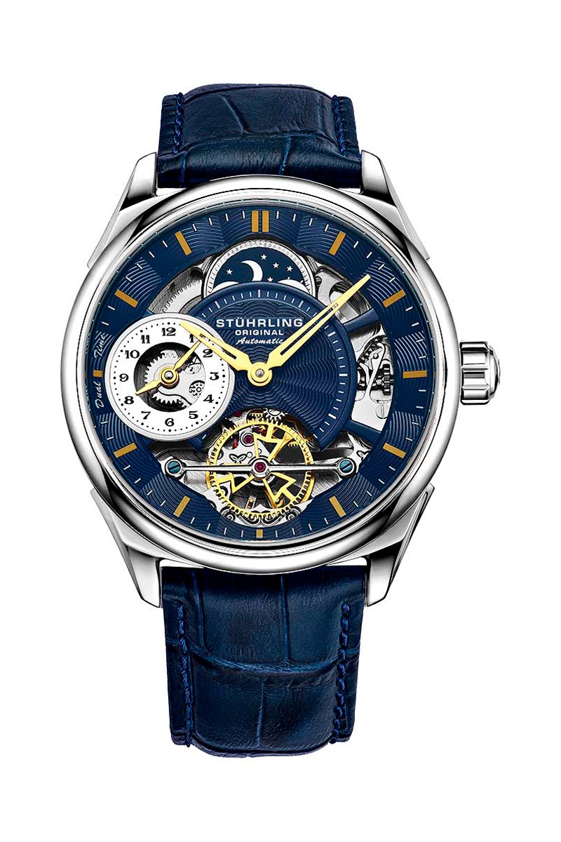 Relógio automático em couro Legacy Stührling - Função GMT e indicadores das fases da lua - Azul-marinho e prateado