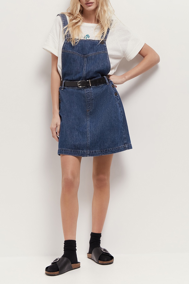 Vestido-jardineiras de ganga.