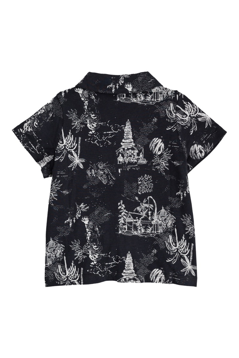 Aplicação com inscrição, estampado decorativo e logótipo de lado.
