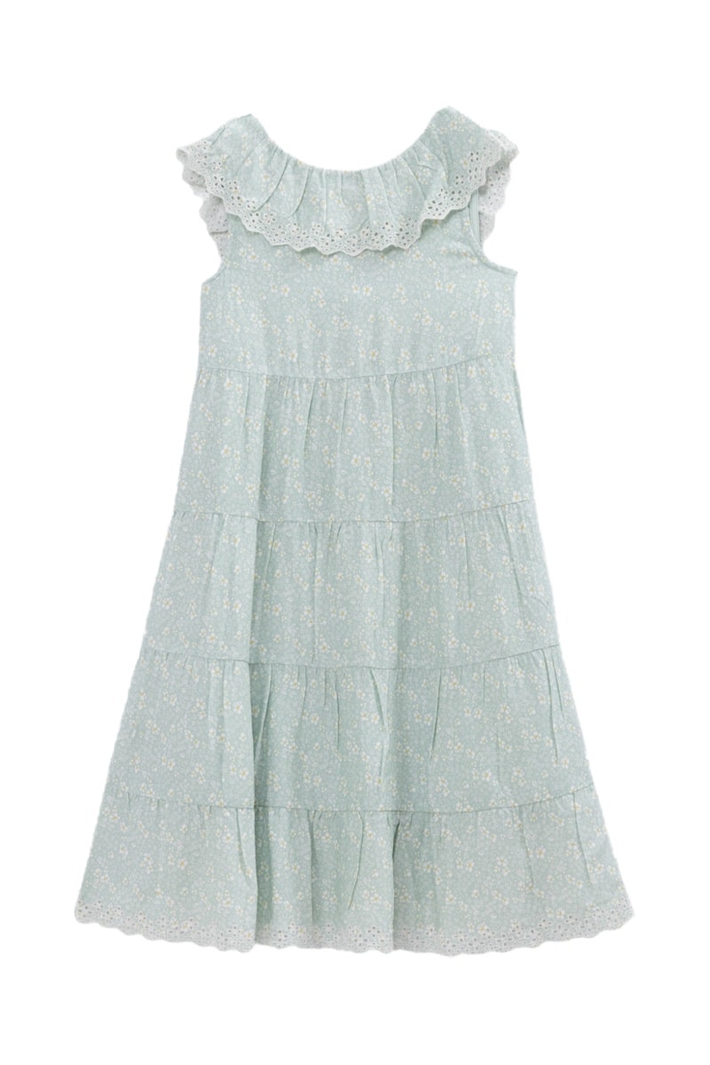 Folhos com bordado inglês nos ombros, à frente, atrás e na base.