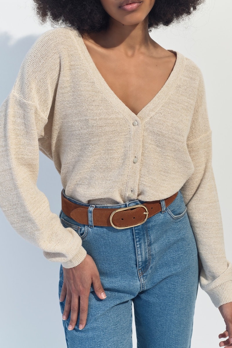 Composição: 33% linho, 32% poliéster, 32% viscose e 3% fibra metálica