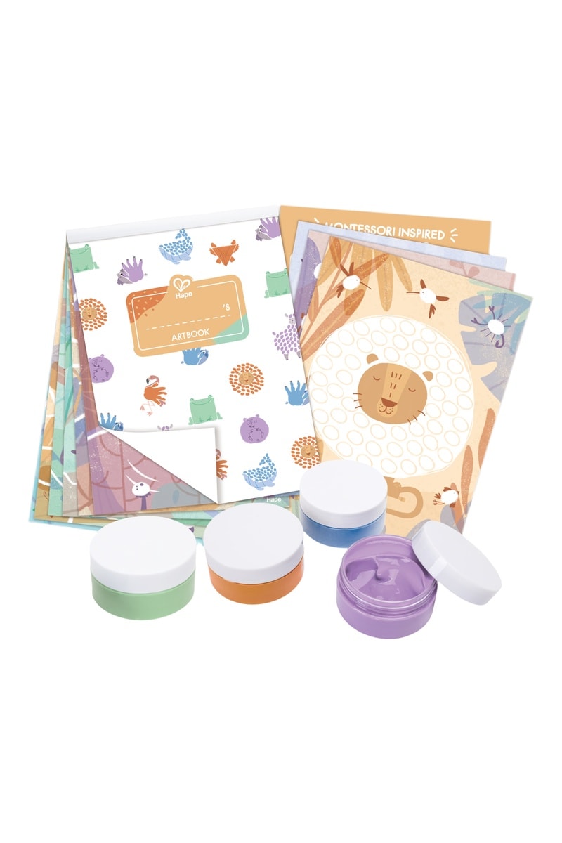 4 potes de tinta de dedo e álbum de atividades A4 com 8 páginas incluídas.