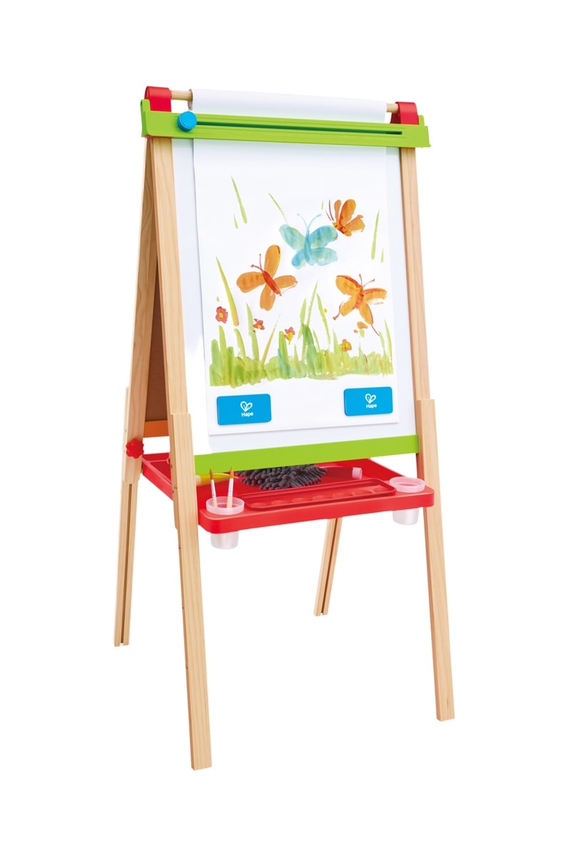 A criança usa o cavalete para desenhar no quadro branco magnético ou no quadro negro a giz, ou para pintar no papel desenrolável.