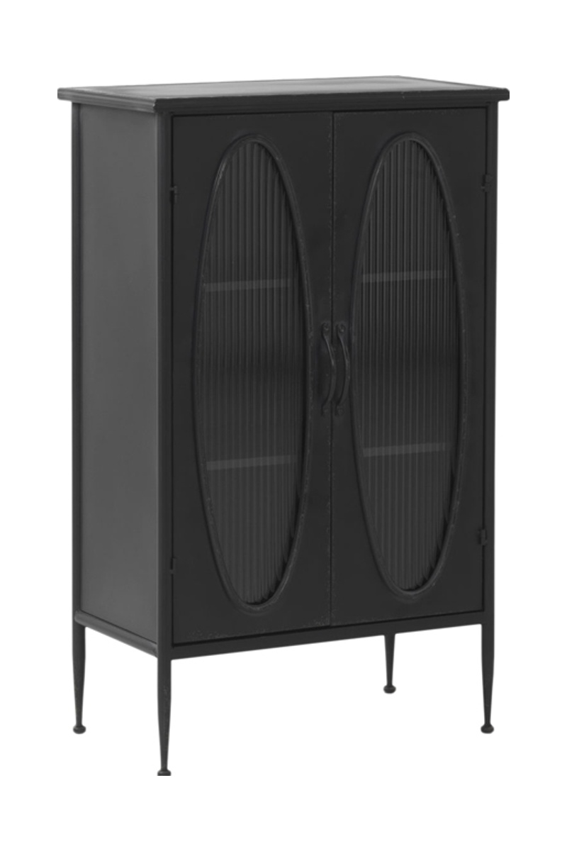 Esta vitrine, com estrutura metálica e porta em cristal de forma oval, possui um acabamento envelhecido de cor ferrugem nas bordas e nos pés.