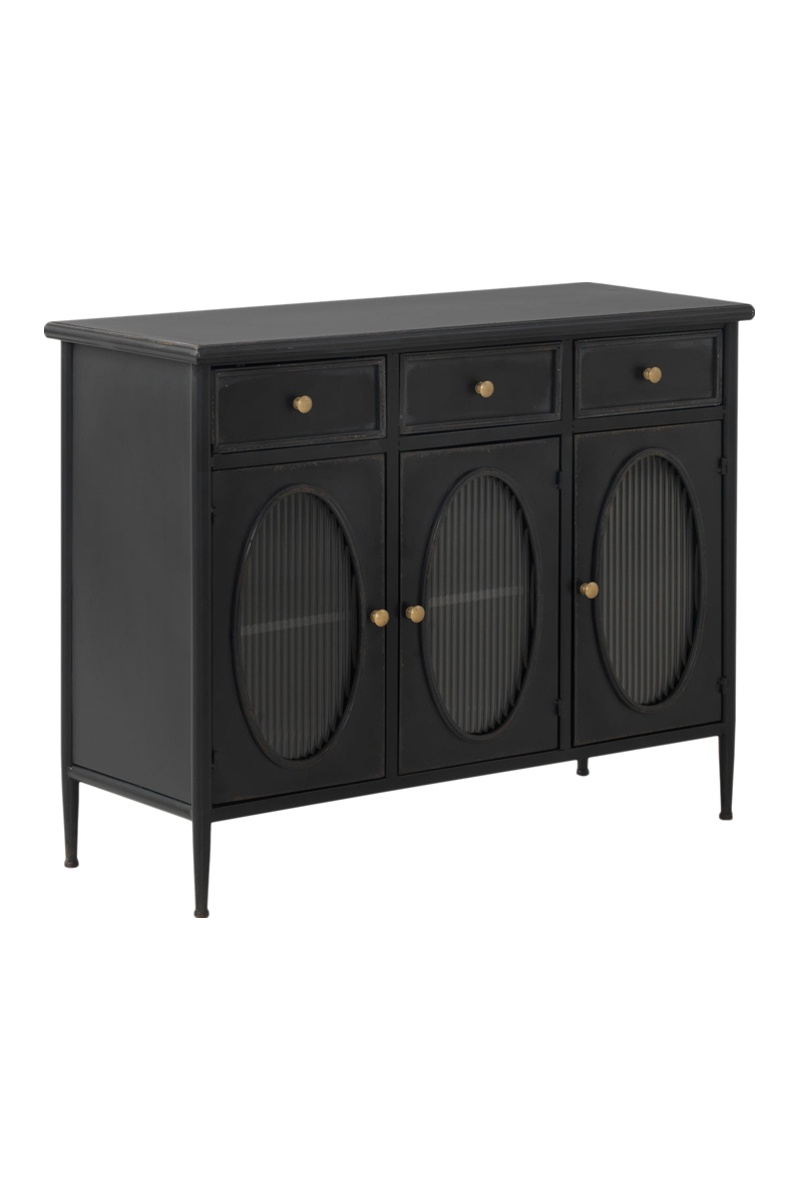 Este móvel é caracterizado pela sua estrutura metálica com portas ovais e três gavetas.