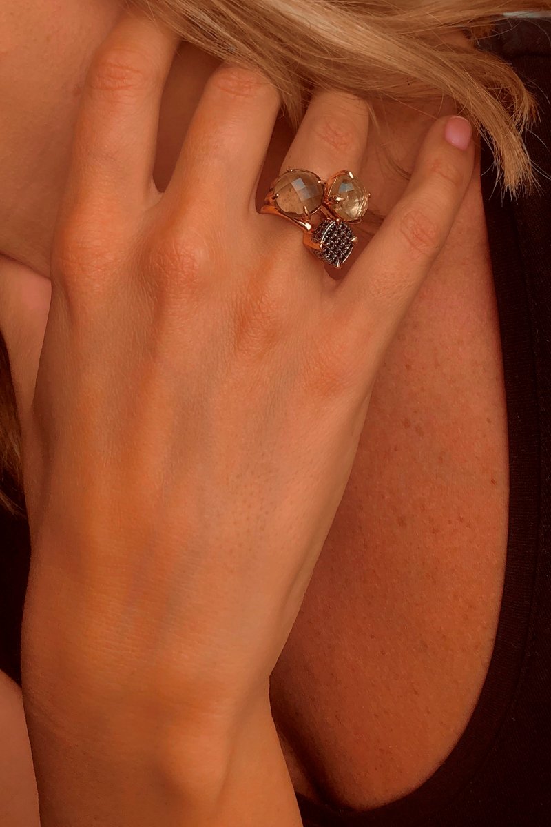 3 anéis - Prata, prata banhada a ouro rosa e quartzo