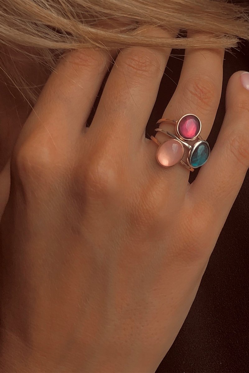 3 anéis em prata e prata banhada a ouro rosa com turmalinas, quartzo e topázios.