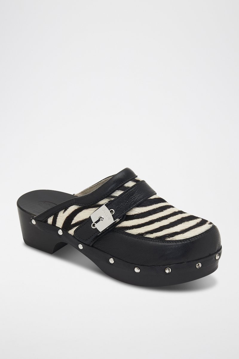 Socas em couro de pónei Clog - Preto e branco - Branco e preto