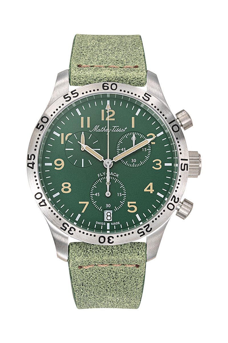Relógio de quartzo em couro Flyback - Cronógrafo - Verde e prateado