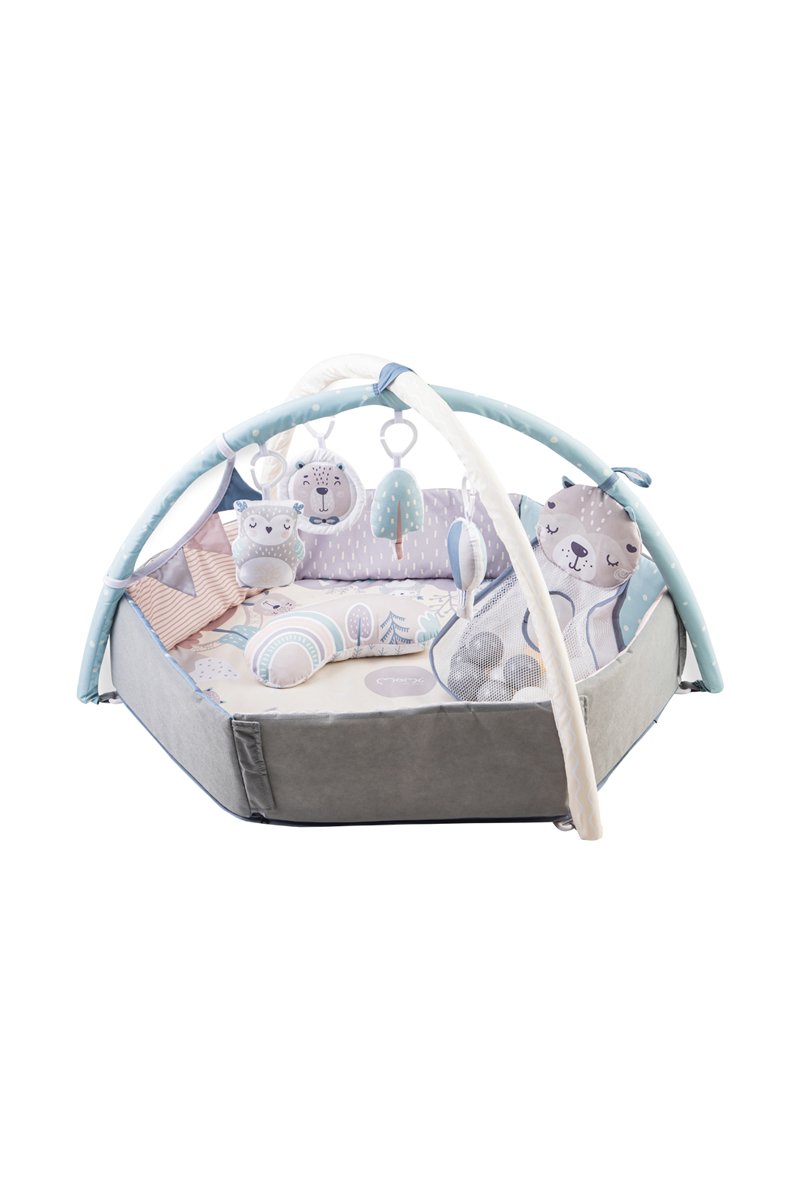 Tapete educativo com brinquedos sensoriais.