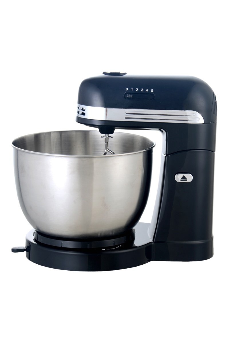 Gancho de amassar, batedeira, batedor com proteção e espátula incluídos.