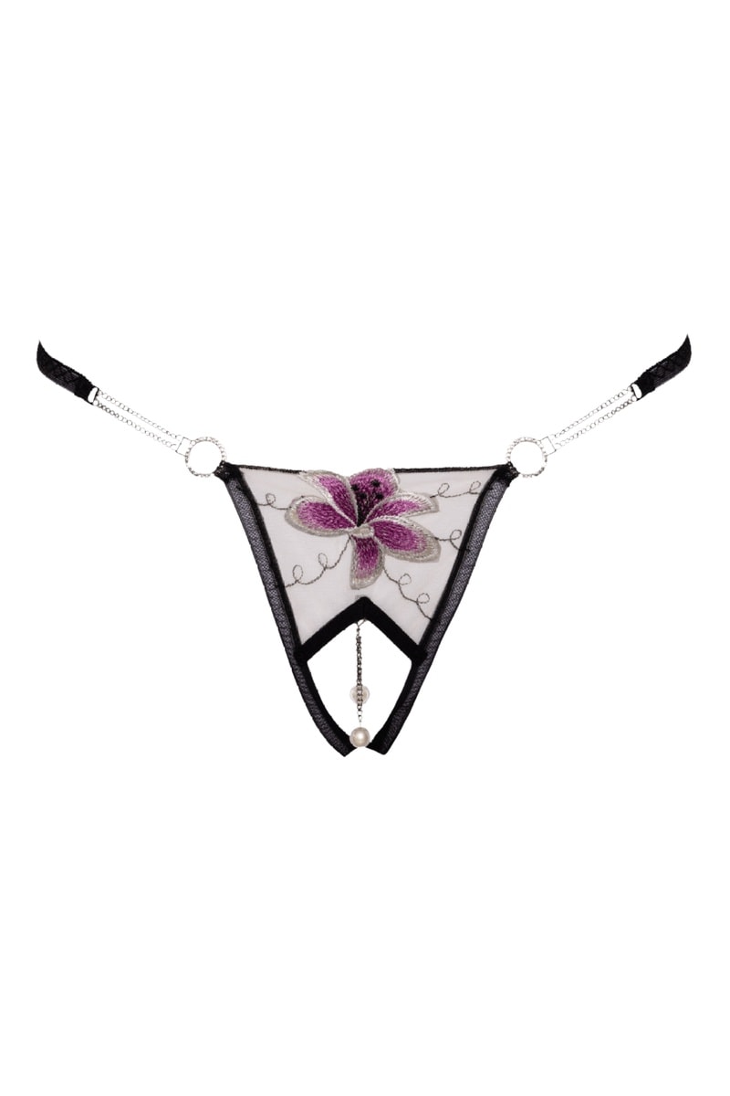 Dois correntes pequenas pendentes com pérolas decorativas entre as pernas.
