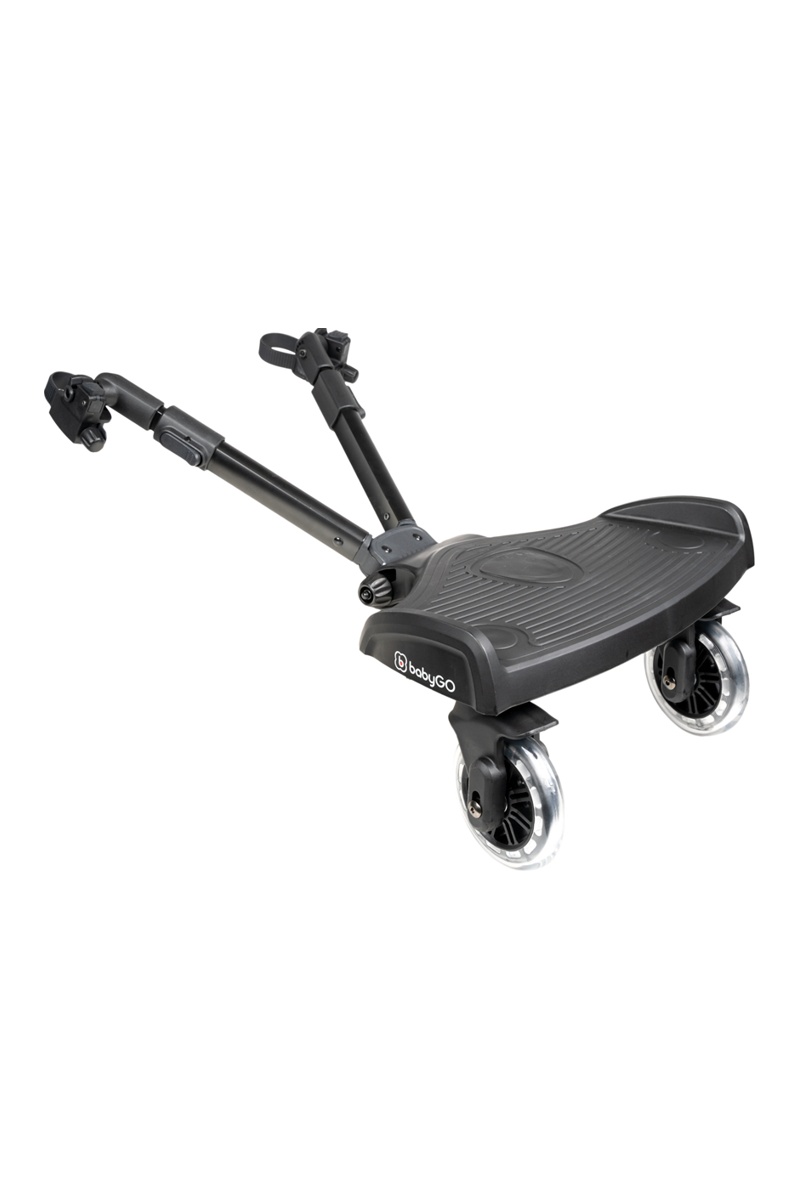 Esta plataforma prática pode ser facilmente fixada a quase todos os carrinhos de bebé e pode ser guardada para economizar espaço quando não estiver a ser utilizada.