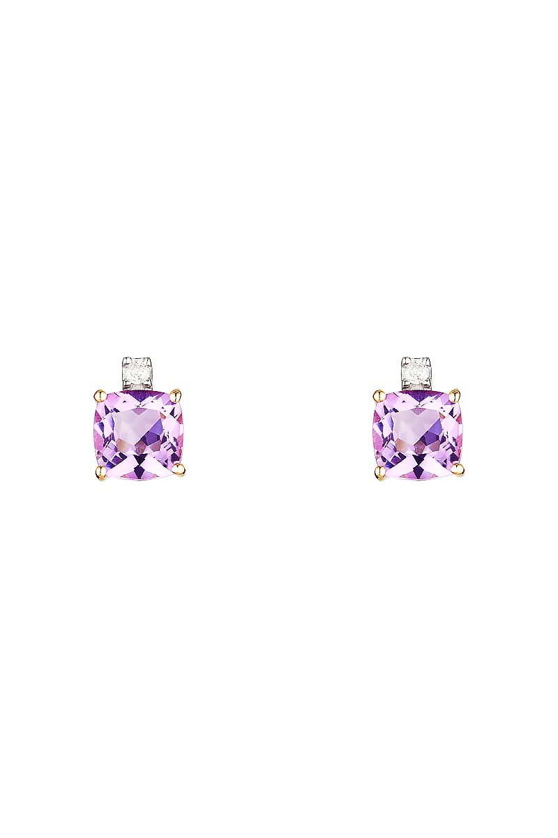 Brincos pequenos de ouro amarelo com um diamante e uma ametista.