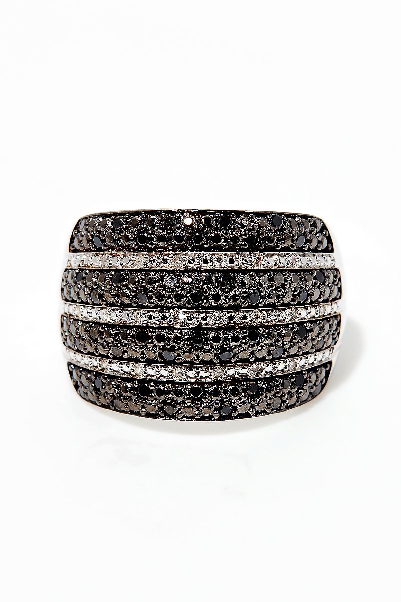 Anel de ouro branco com 20 diamantes brancos e 44 diamantes pretos.